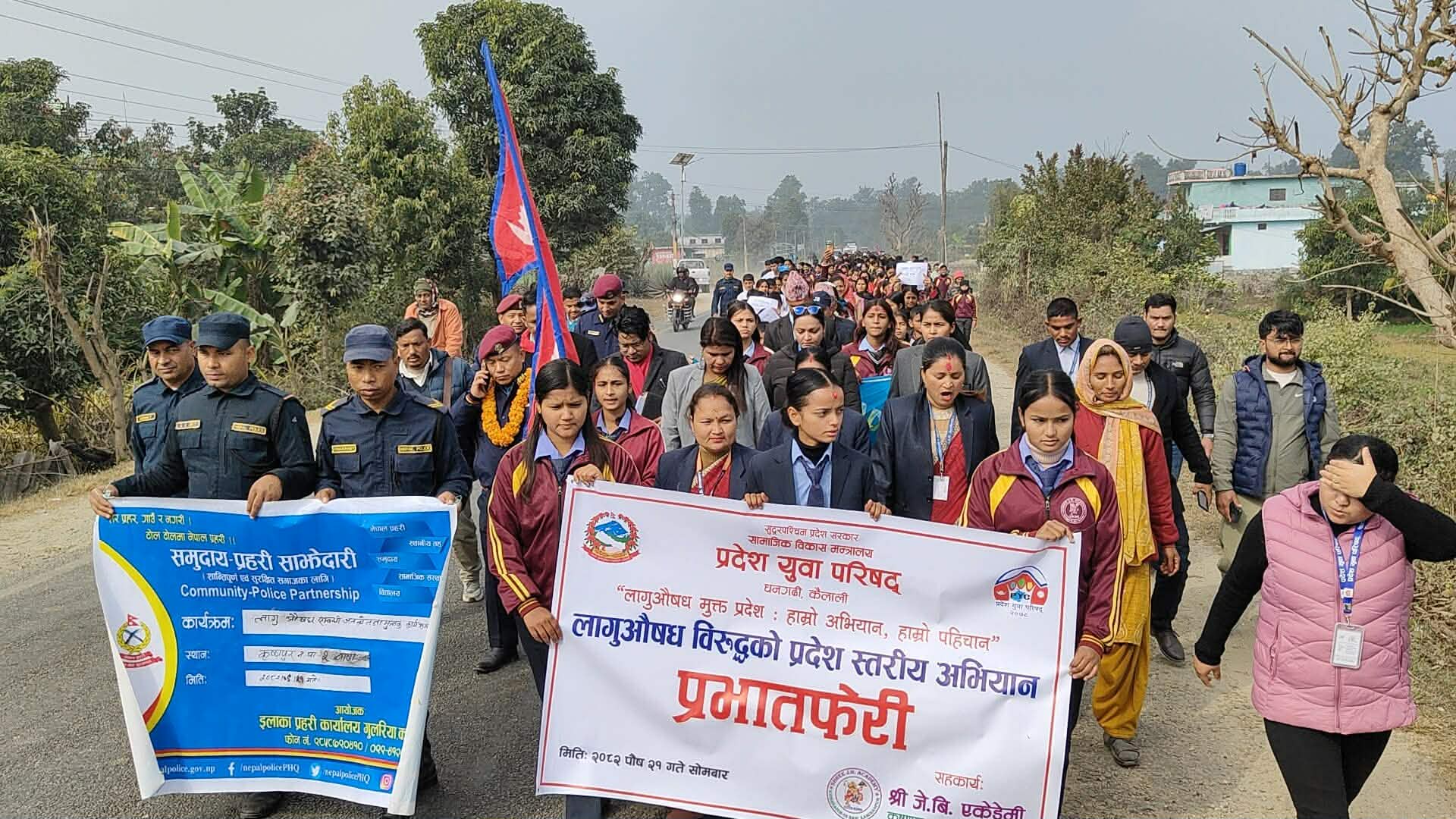 कञ्चनपुर: सुदूरपश्चिम प्रदेशलाई लागूऔषधमुक्त बनाउने उद्देश्यसहित प्रदेशस्तरीय प्रभातफेरी कार्यक्रम सम्पन्न भएको छ। सुदूरपश्चिम प्रदेश सरकारअन्तर्गत सामाजिक विकास मन्त्रालय तथा प्रदेश युवा परिषद्को आयोजनामा “लागूऔषधमुक्त प्रदेश–हाम्रो अभियान, हाम्रो पहिचान” भन्ने मूल नारासहित कार्यक्रम सञ्चालन गरिएको हो।