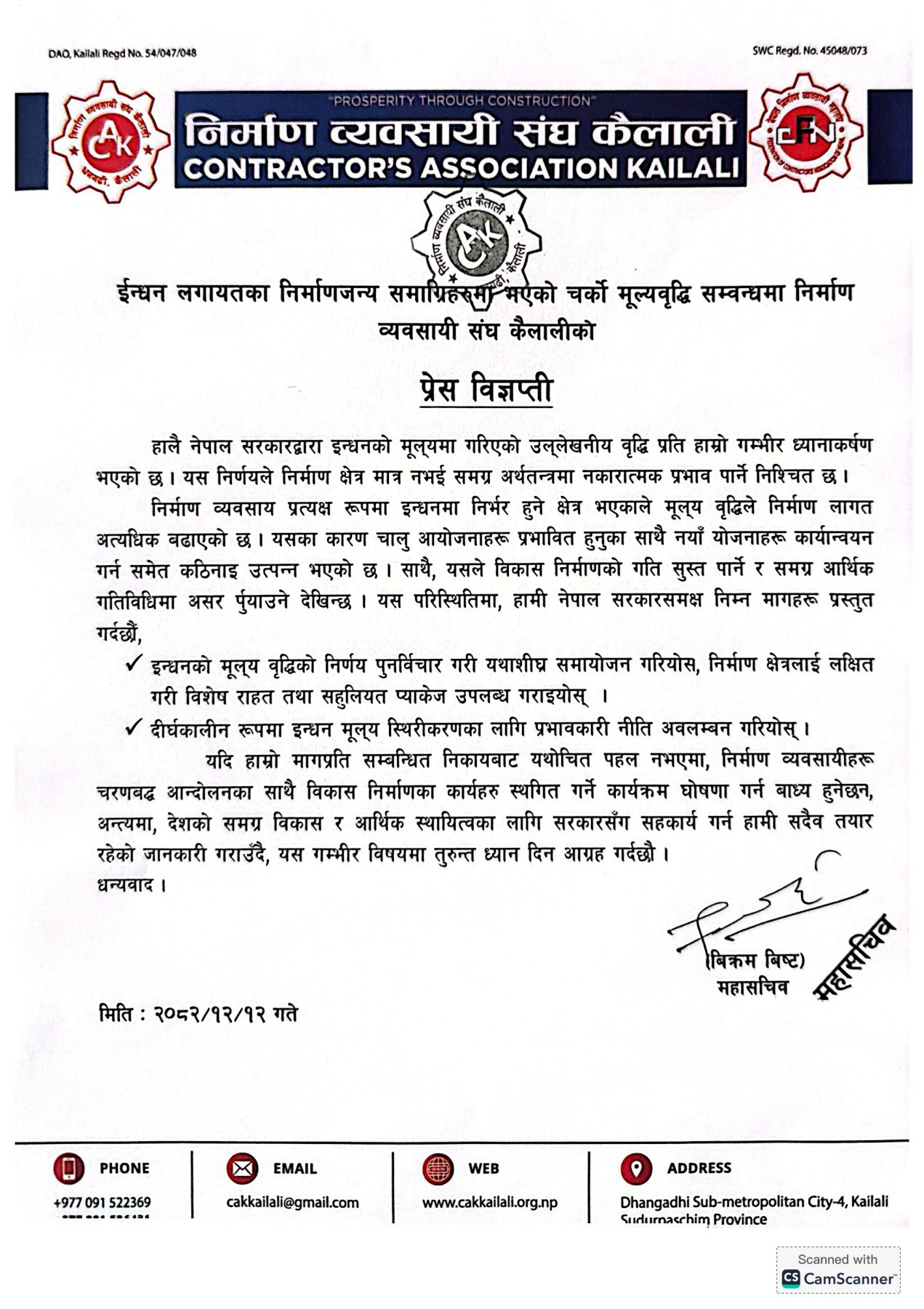 निर्माण व्यवसायी संघ कैलालीका महासचिव बिक्रम बिष्टद्वारा जारी विज्ञप्तिमा मागप्रति सम्बन्धित निकायबाट यथोचित पहल नभएमा चरणबद्ध आन्दोलनका कार्यक्रम घोषणा गर्न बाध्य हुने चेतावनी समेत दिइएको छ।