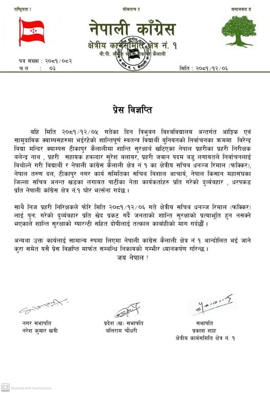 धनगढी, ७ चैत/स्वतन्त्र विद्यार्थी युनियनकोको चुनावका क्रममा चैत ५ गते नेपाली काँग्रेसका पदाधिकारी माथि दुर्व्यवहार गर्ने सुरक्षा कर्मीलाई कार्वाहीको माग गर्दै विज्ञप्ति निकालेको छ । नेपाली कांग्रेस कैलाली क्षेत्र नं १ का क्षेत्रीय कार्यसमितिका सभापति प्रकाश शाह, प्रदेश (ख)का सभापति बलिराम चौधरी, टीकापुर नगर सभापति नरेश कुमार खत्रीले संयुक्त रुपमा बिज्ञप्ती प्रकाशित गरि कार्वाहीको माग गरिएको छ ।